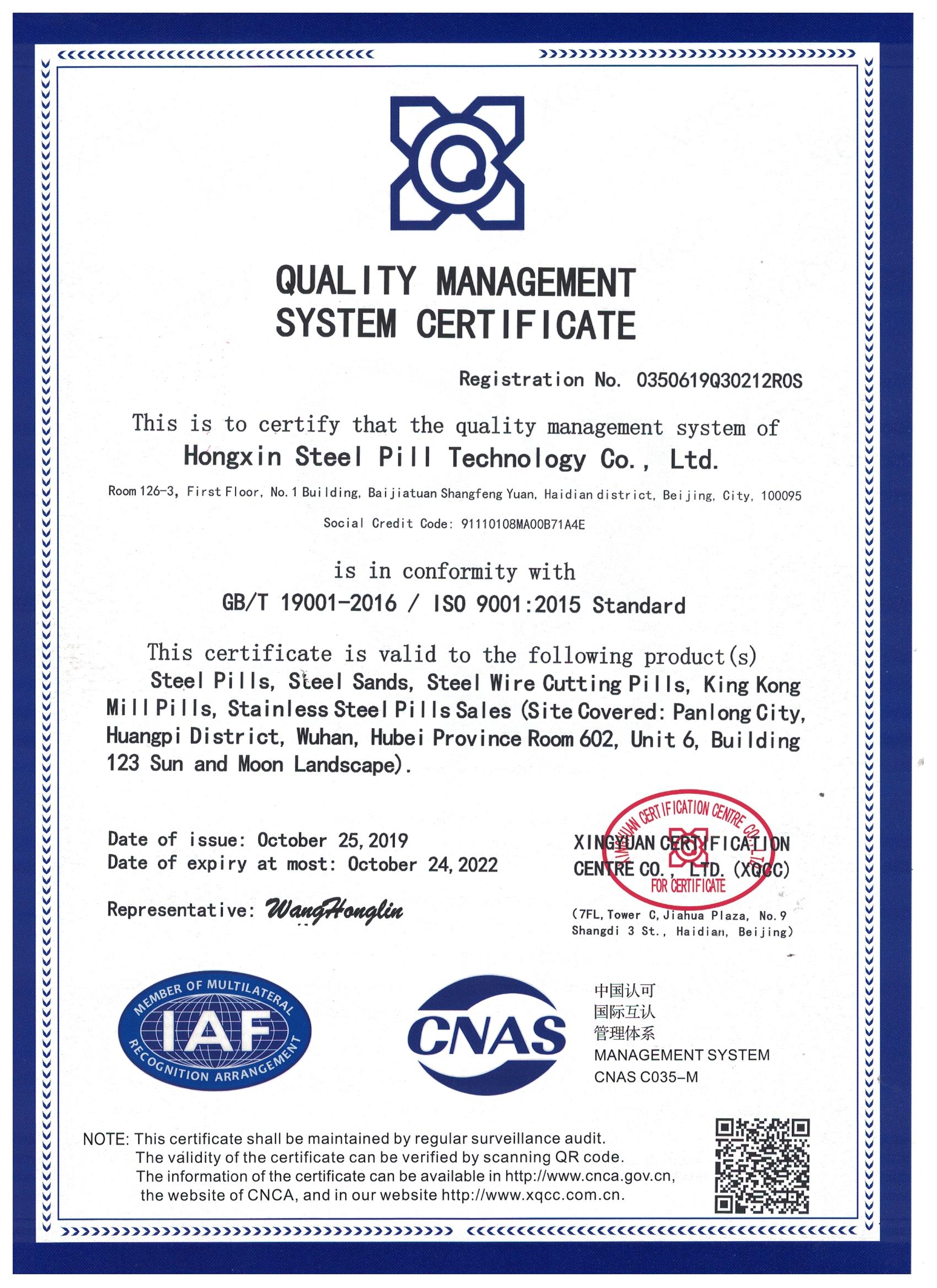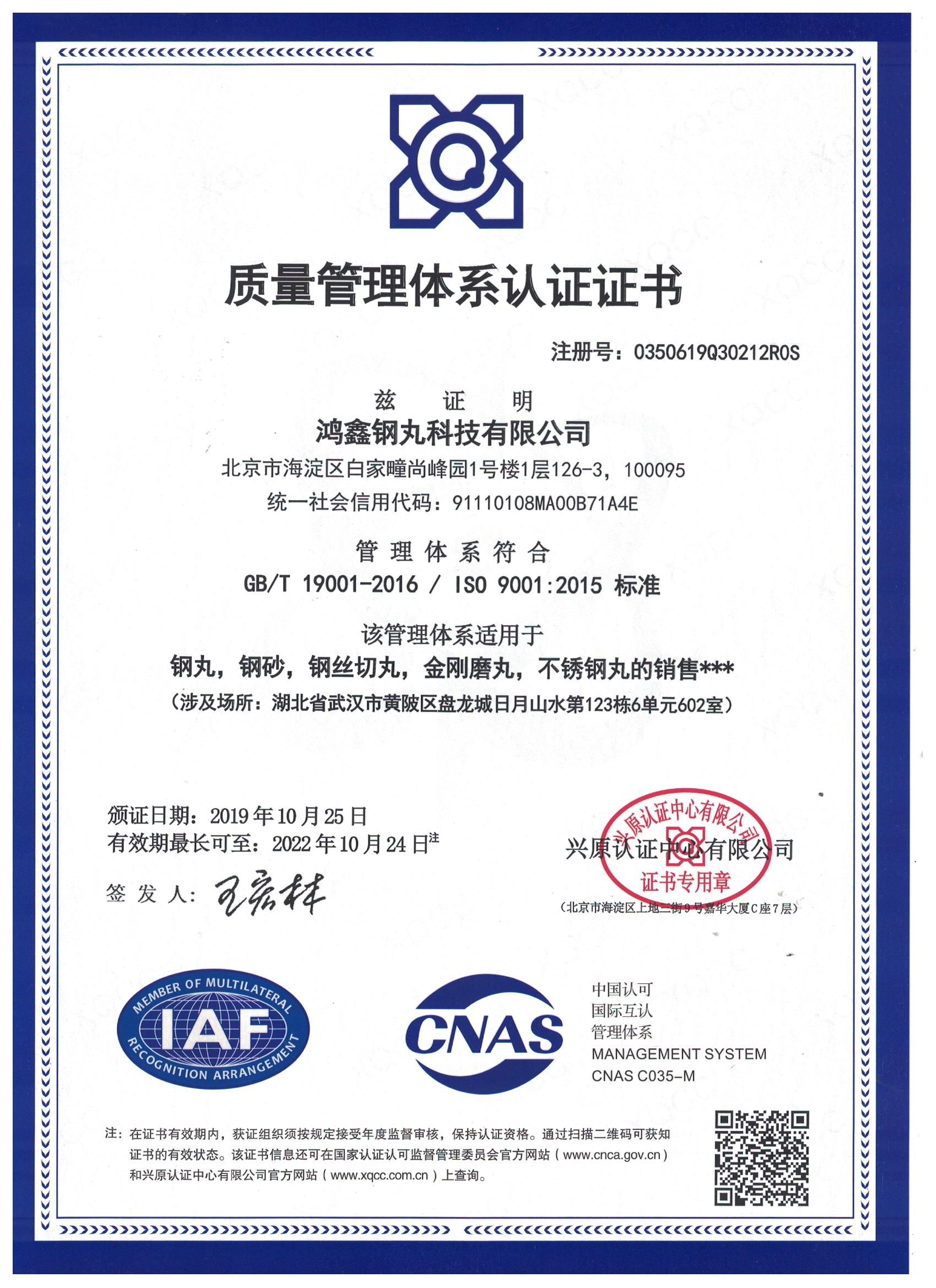 11月12日,歷時3個多月的申報,鴻鑫鋼丸獲得興原認(rèn)證證書,此證書證明我們鴻鑫鋼丸管理體系符合GB/T19001-2016,ISO9001-2015標(biāo)準(zhǔn),該管理體系適用于鋼丸,鋼砂,鋼絲切丸,金剛磨丸,不銹鋼丸的銷售。
